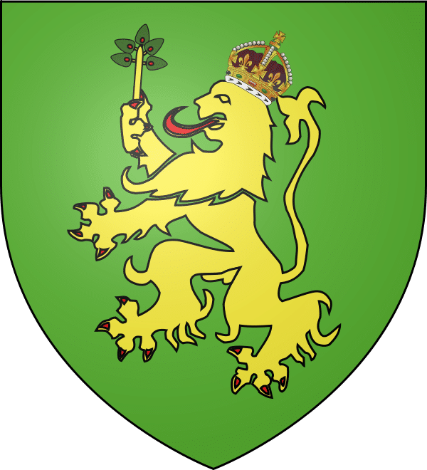The Coat of Arms of Alderney features a golden lion holding a small branch of a plant on a green shield. It is also seen with a golden border on the Flag of Alderney
