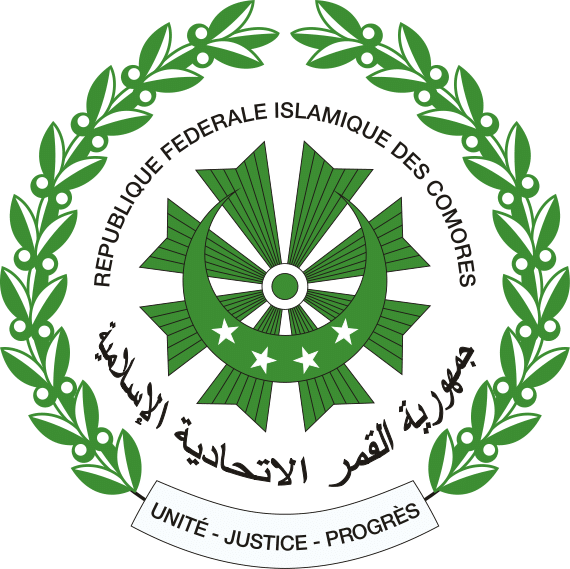 The national motto, ‘UNITÉ – JUSTICE – PROGRÈS’, is underneath the seal and ‘REPUBLIQUE FEDERALE ISLAMIQUE DES COMORES’ is above.