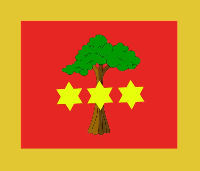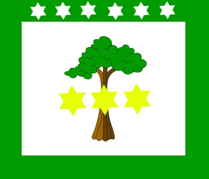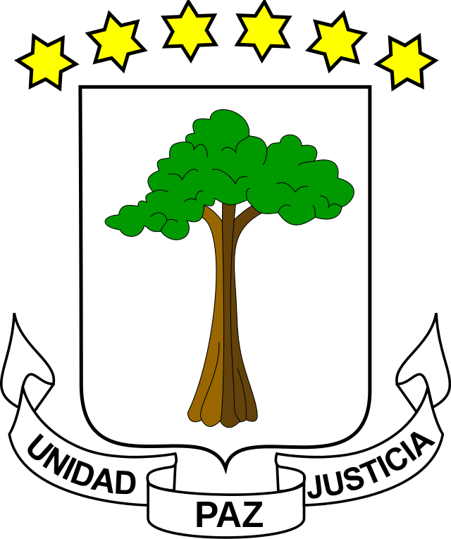 The Coat of Arms of Equatorial Guinea was adopted at the same time as the modern flag on the 21st August 1979. It is the same as the Coat of Arms from 1968. It features a shield with a silk cotton tree at the centre with six, six-sided, stars above and the motto “UNIDAD, PAZ, JUSTICIA” underneath.