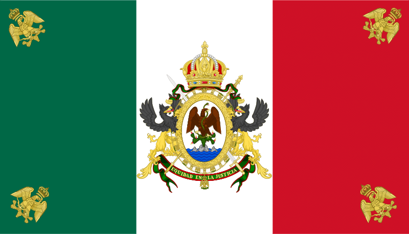Mexico’s failure to repay outstanding loans to France, Spain and Britain lead the Emperor Napoleon III the invade the country and introduction of a monarchy sympathetic to French interests. The newly crowned Emperor Maximillian commissioned a new Mexican flag not only bearing the eagle and snake motif, but also ostentatiously laden with rampant griffins and the golden trappings of royalty.