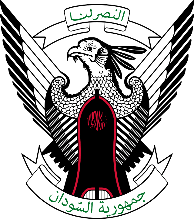 The Emblem of Sudan was adopted in 1985 and features a black shield with red border in front of a Secretery bird. Above the bird is the motto “VICTORY IS OURS” and below is “REPUBLIC OF SUDAN”.