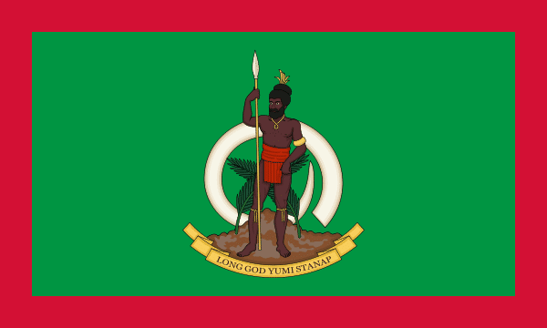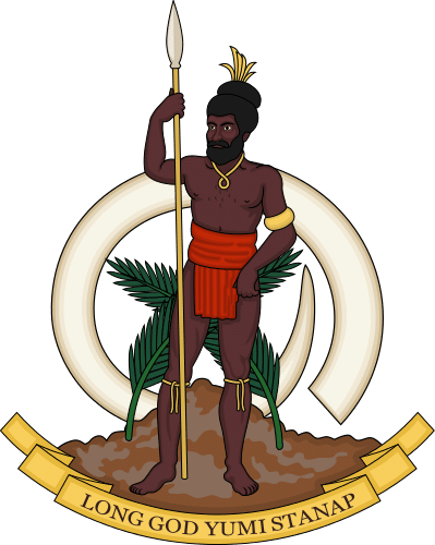 The Coat of Arms of Vanuatu was adopted in 1980. The emblem depicts a Melanesian warrior protesting a boar’s tusk and a banner stating “IN GOD WE STAND, IN BISLAMA”.