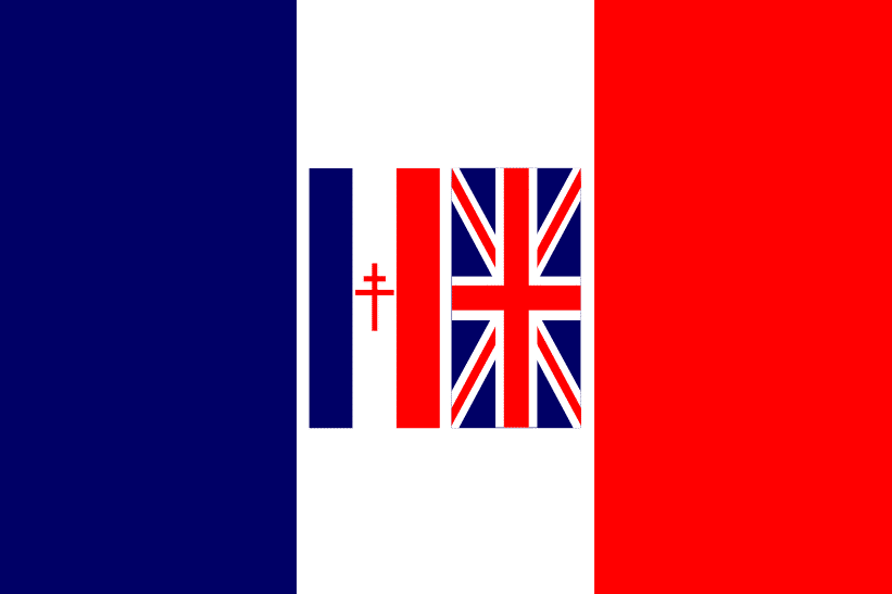 During World War Two the Free France flag of the French government-in-exile would have been flown. The flag is the blue-white-red vertical tricolour of France with a red Croix de Lorraine in the centre.