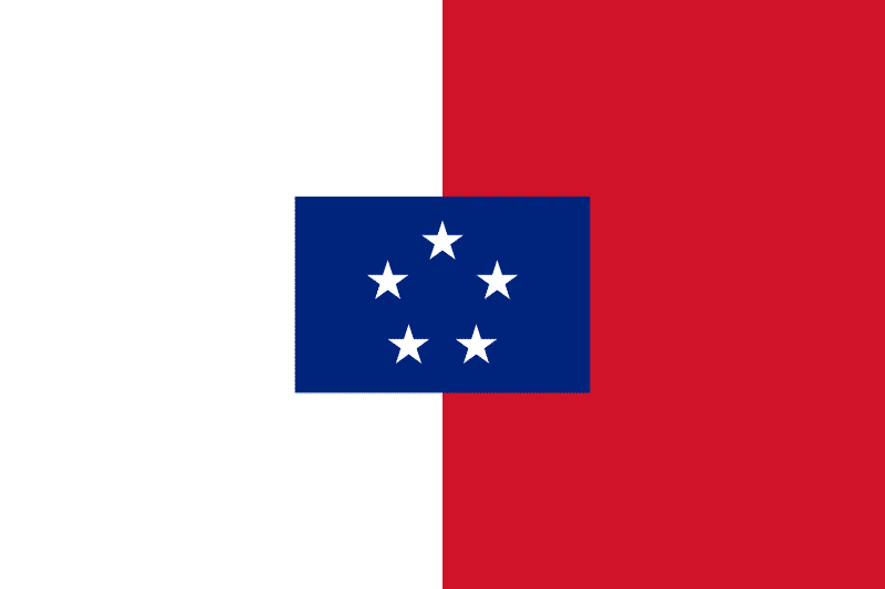 In 1887 a white-red horizontal bicolour with blue rectangle and a circle of five-five pointed stars was adopted as the flag of the Anglo-French Joint Naval Commission. The area was declared Vanuatu neutral territory between France and Britain. When Franceville declared independence, the flag remained the same.