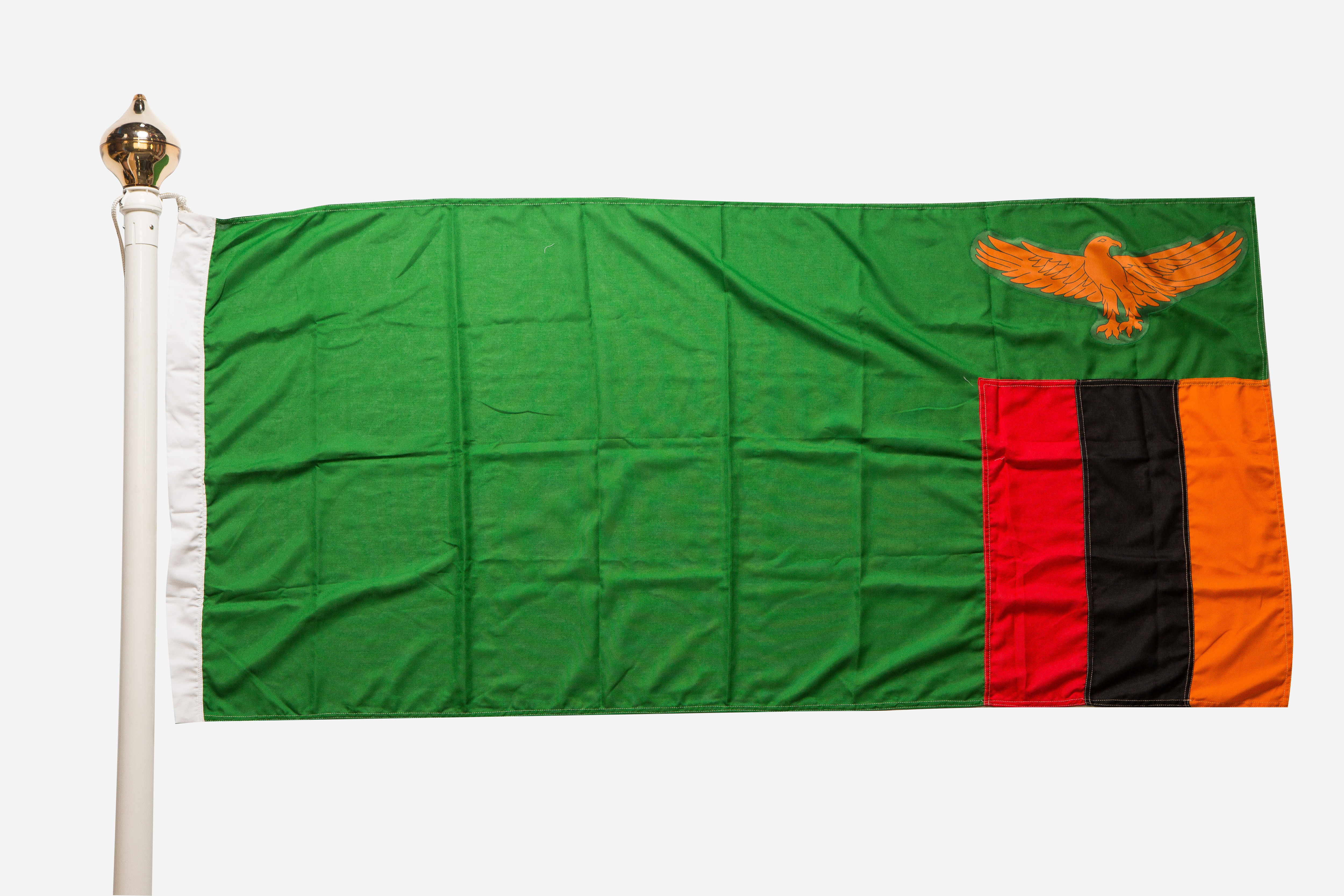 All of our printed Zambia flags are made by a process called Dye Sublimation. This process impregnates the fibres of the fabric, the result is a flag that has very accurate colour, and importantly the design appears clearly on both sides of the flag. This is known as ‘printed through to reverse’ and is an important consideration when choosing your flag as both sides will be seen when flying.