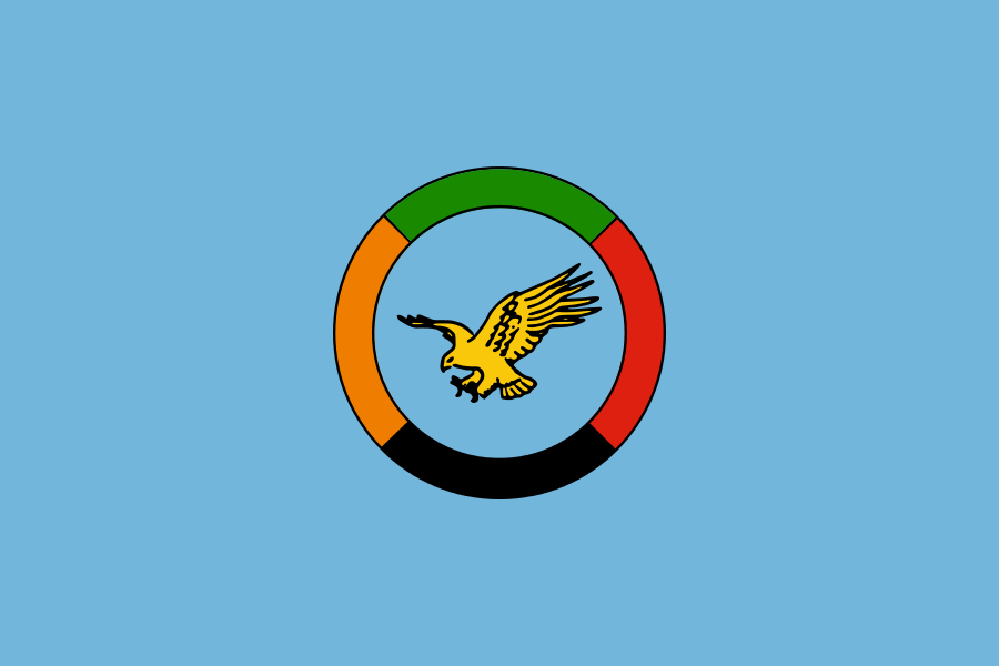 Both ensigns have sky blue field with a circle at the centre. The circle for the air force flag is gold bordered and split into a green, red and black segments with eagle at the centre .The circle for the civil flag features a yellow eagle at the centre and a red-green-orange-black multi-coloured border.