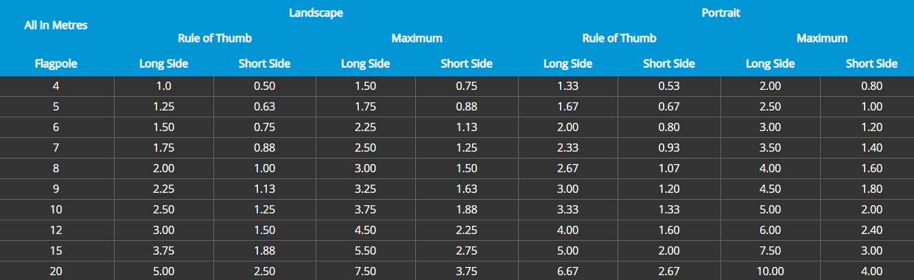 A good rule of thumb for Landscape flags is that the long edge of the flag should be 25% of the height of the pole, and the short edge is usually 50% the length of the long edge. For example an 8m pole would suit a 2m x 1m flag.