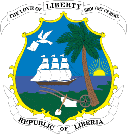 Above the shield is the motto “THE LOVE OF LIBERTY BROUGHT US HEAR” and below is “REPUBLIC OF LIBERIA.”