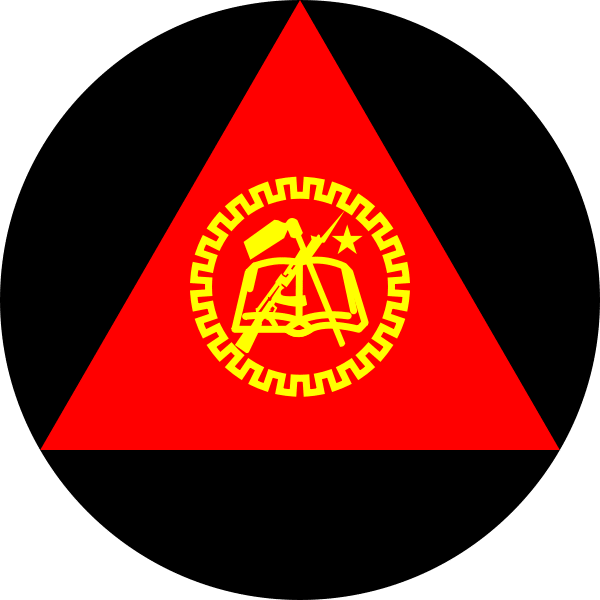 The Roundel of the Air Force of Mozambique features a black circle with a red triangle, inside of which is an outline of the cogwheel, crossed AK-47 and hoe, open book and five-pointed gold star.