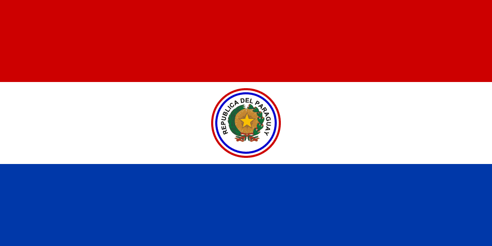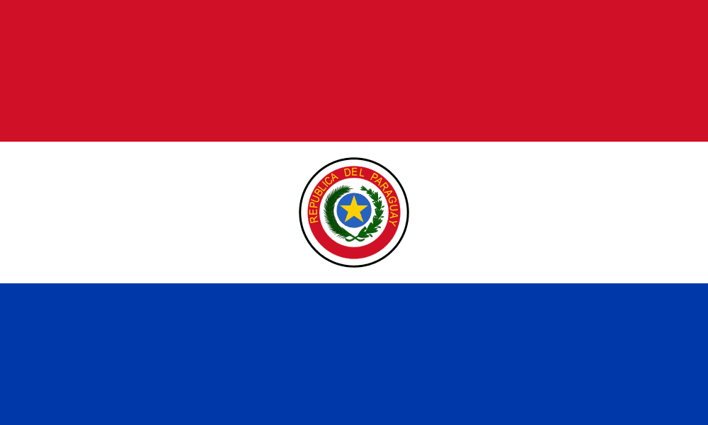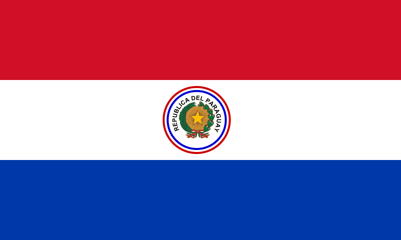 In 1842 the proportions of the red-white-blue tricolour was changed to 2:3. An emblem was added to the flag that featured a golden circle with five-pointed star surrounded by an olive brand and a palm branch with the words “REPUBLIC DE PARAGUAY” above.